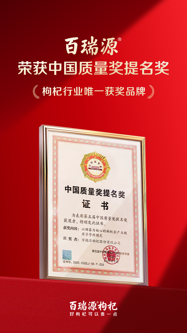 中国枸杞行业“零的突破”,百瑞源荣获中国质量奖提名奖